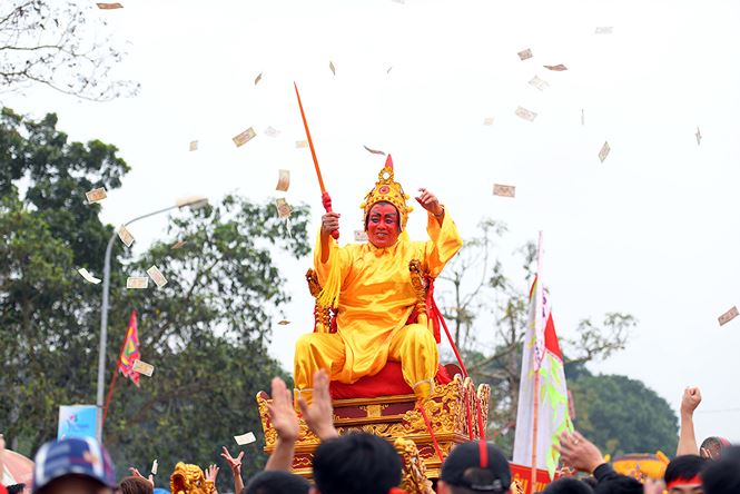 Kiệu rước Vua di chuyển nhẹ nhàng cùng đoàn dài kèn trống vây quanh múa rước.
